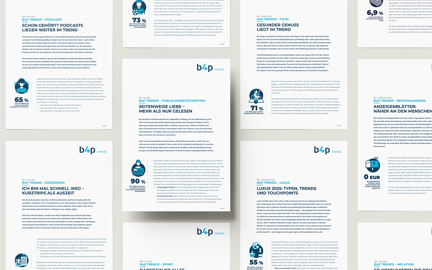 Das Joint Venture von fünf großen Medienhäusern veröffentlicht nicht nur diese große Markt-/Media-Studie, sondern auch ausgewählte Sonderauswertungen – sogenannte Trendreports. Sie bieten einen kompakten, leicht zugänglichen und spannenden Zugang zu sonst eher trockenen Studiendaten. Und weil genau das eine Kernkompetenz der LWP Kommunikation ist, dürfen wir einige dieser Trendreports im Auftrag der GIK umsetzen. Zuletzt zum Beispiel die Reports zu Luxus, zur besonderen Liebe zu Zeitschriften oder zu Kurzreisen.